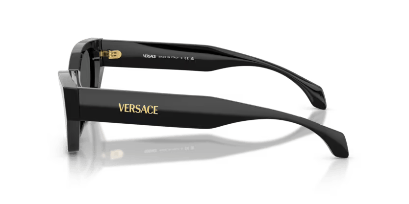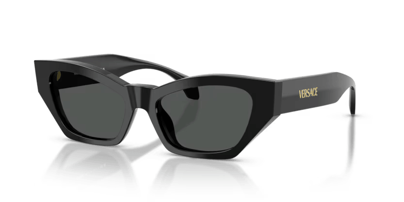 Elegancia y actitud en un solo diseño. Este modelo de sol con forma de ojo de gato y armazón de acetato negro refleja el estilo sofisticado y vanguardista de Versace. Pensado para mujeres que buscan un accesorio distintivo, combina moda y protección en cada uso.